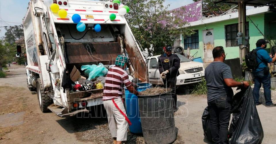 En camión recolector de desechos, El Chavo y Batman regalan juguetes en Madero