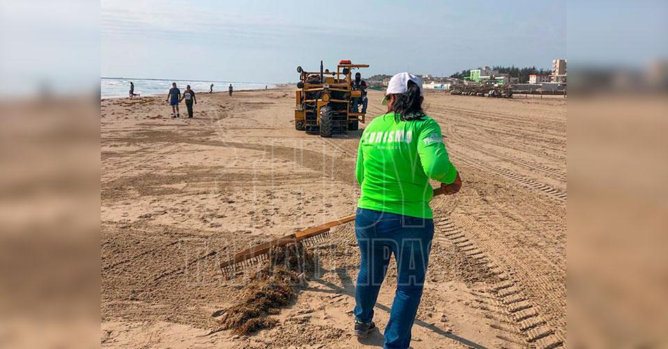 En Ciudad Madero: Cuadrillas de trabajadores retiran sargazo de playa Miramar