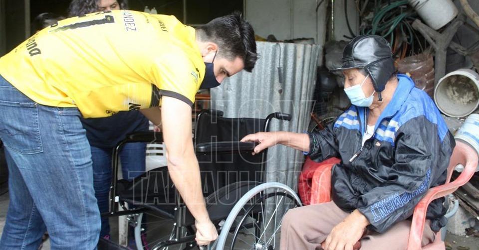 Entrega Carlos Fernández silla de ruedas a don Rogelio Hernández