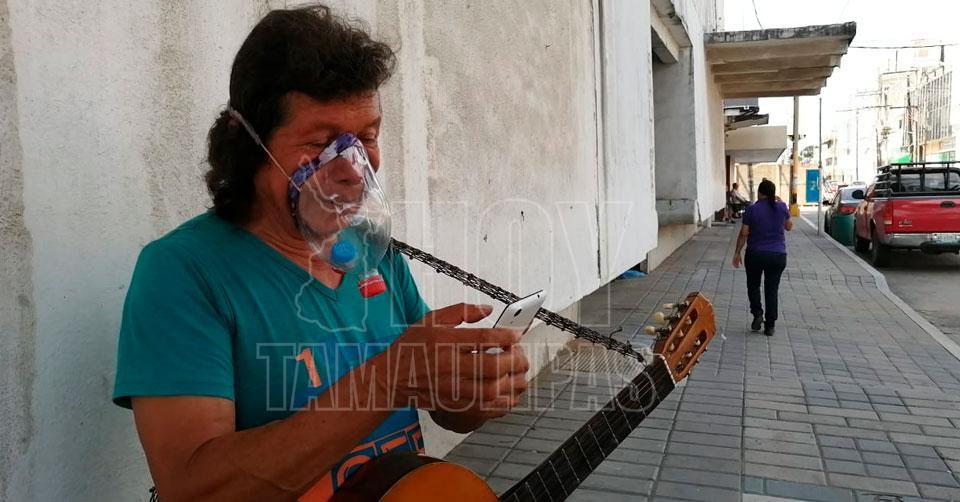 En Ciudad Madero: Don Juan hace sus cubrebocas con plástico para salir a tocar su guitarra