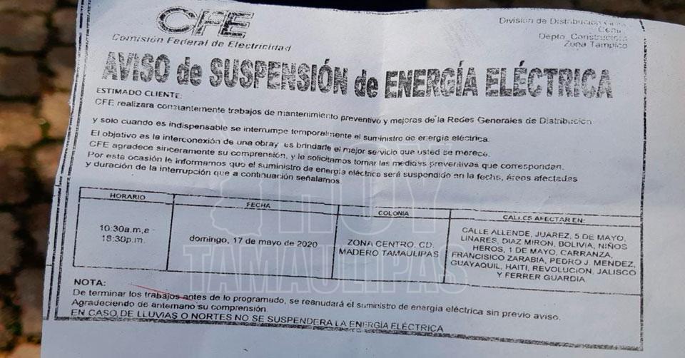 La zona centro de Ciudad Madero se quedará sin energía eléctrica
