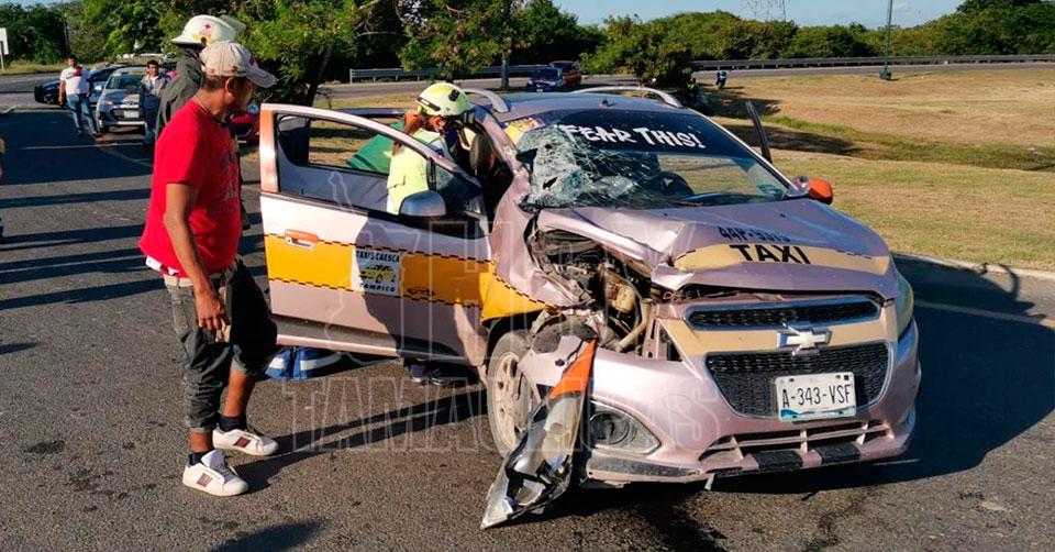 Tráiler se pasa alto en Tampico y lo choca taxi; dos lesionados