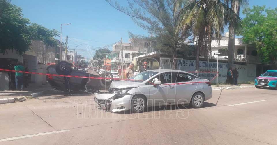 Autobús de Urban impactó a un taxi y lo destrozó contra un poste de la CFE en Tampico