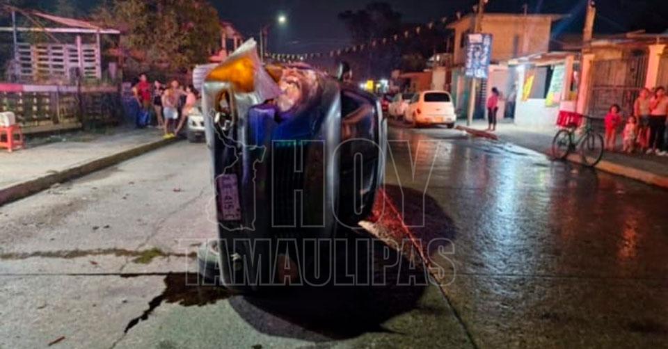 Vuelca automóvil tras chocar contra camioneta estacionada en Tampico