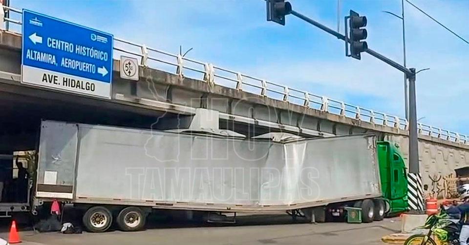 Trailero perdió la "brújula" y atoró su unidad bajo un puente en Tampico