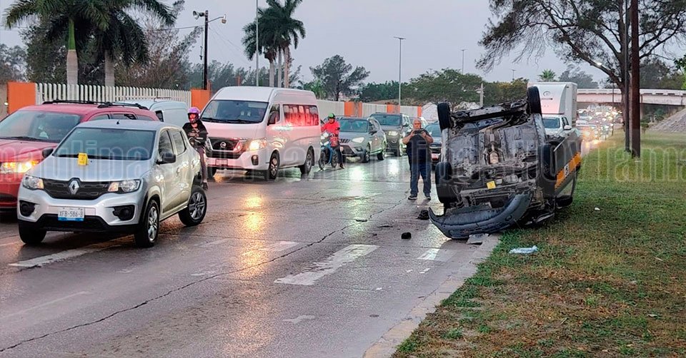 Taxista sufre aparatosa volcadura en Tampico por exceso de velocidad