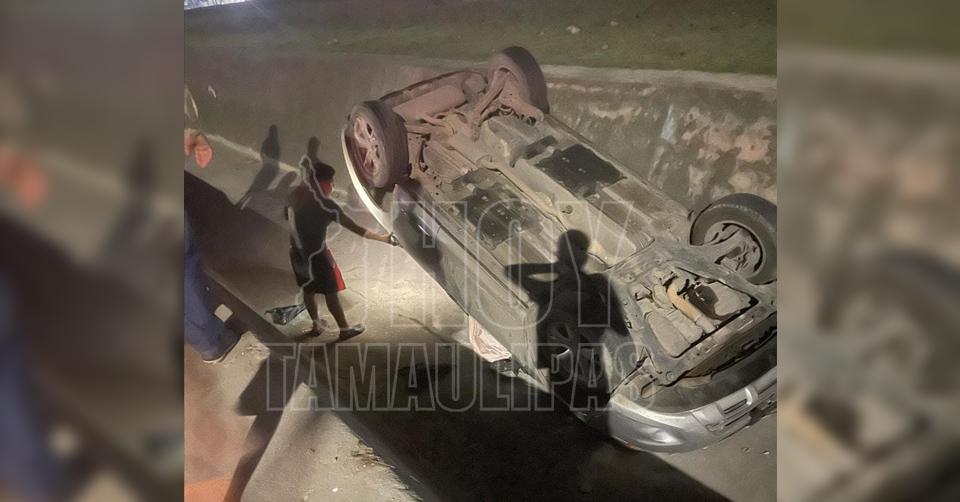 Automóvil se salió del camino y terminó volcado al fondo de un canal en Tampico