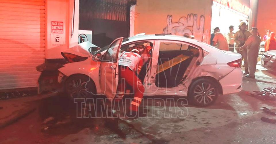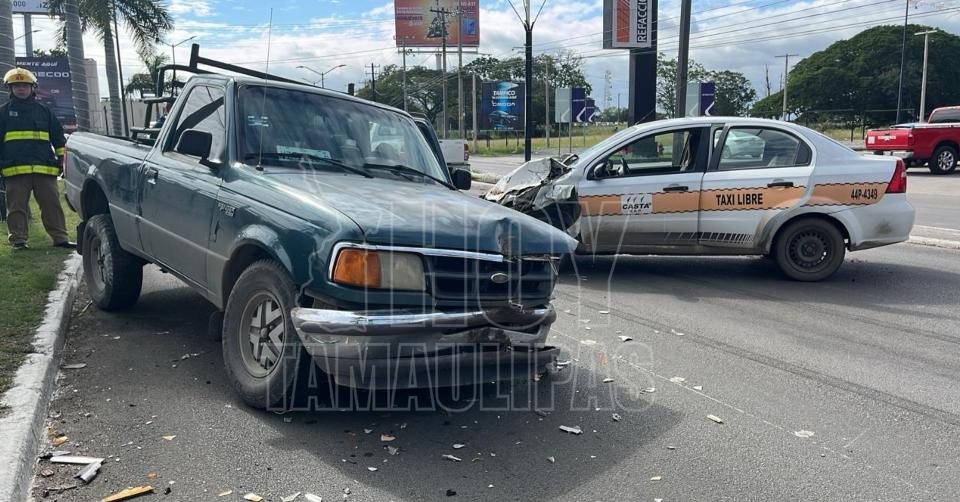Brinca camellón, tumba palmera y se impacta contra taxi, en Tampico
