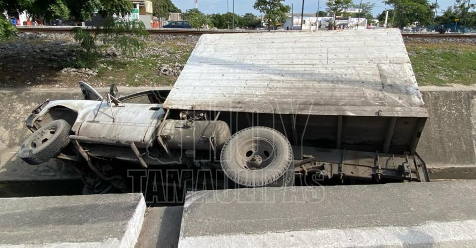 Camioneta de tres toneladas y media derrapa, vuelca y cae a canal en Tampico