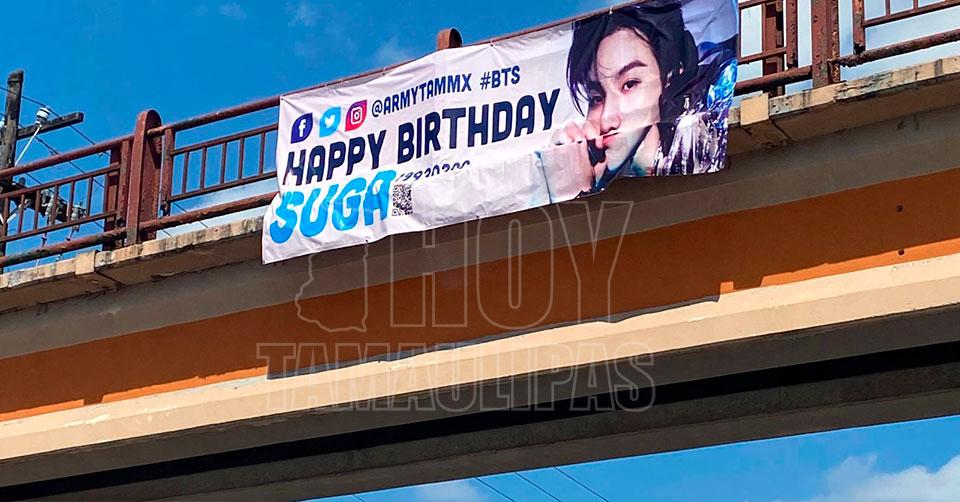 Cuelgan mantas en puentes peatonales de Matamoros para felicitar a integrante de BTS