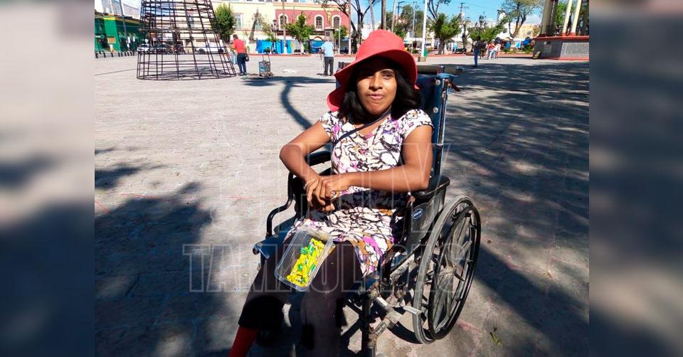 Sarahí vende chicles en su silla de ruedas para mantenerse
