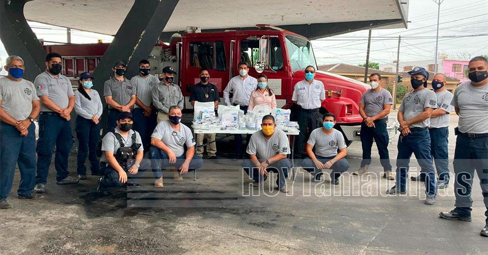 Ivett Bermea entrega material de cuidado personal a PC y Bomberos de Matamoros