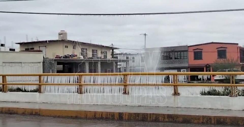 Fuga de agua se congela sobre puente en Reynosa