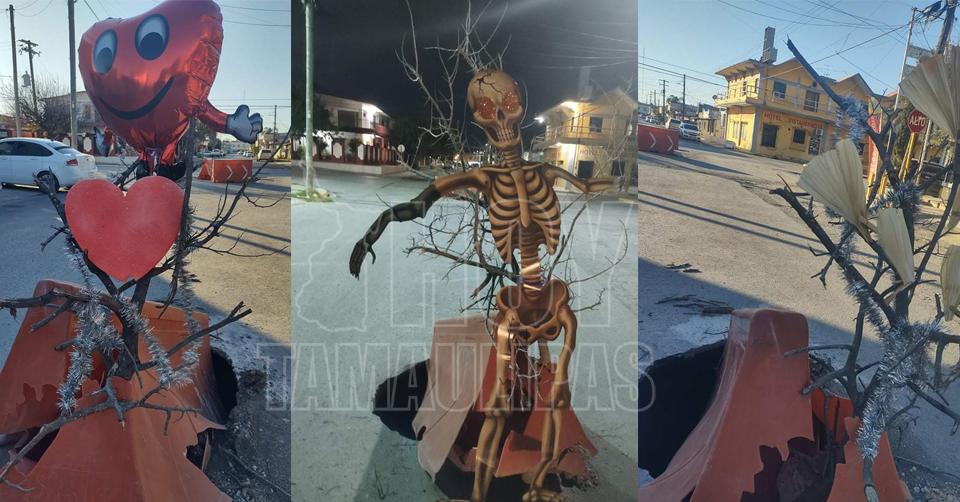 Vecinos adornan socavón de más de 1.50 mts. de profundidad ante nula respuesta de autoridades