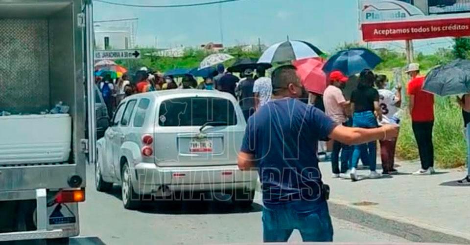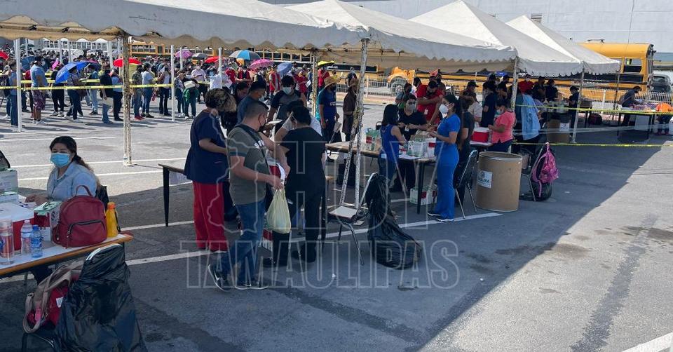 Reparten agua y bolis a jóvenes que esperan vacunarse en Reynosa