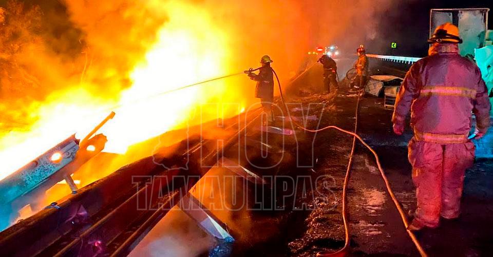 Muere trailero calcinado en carreterazo con incendio cerca de Nuevo Laredo
