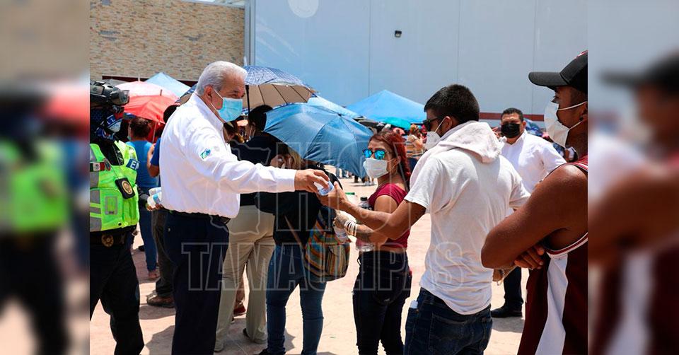 En Nuevo Laredo: Reparte Arturo Sanmiguel agua embotellada a jóvenes que acuden a vacunarse