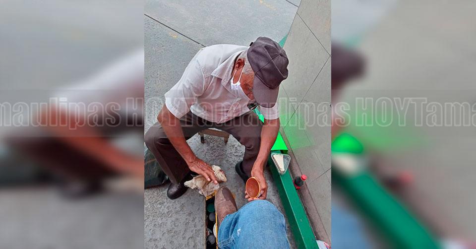 Abuelito pide ayuda boleando zapatos afuera de un SMart en Nuevo Laredo