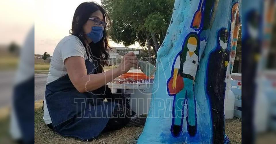 Artista neolaredense pinta árbol para hacer conciencia