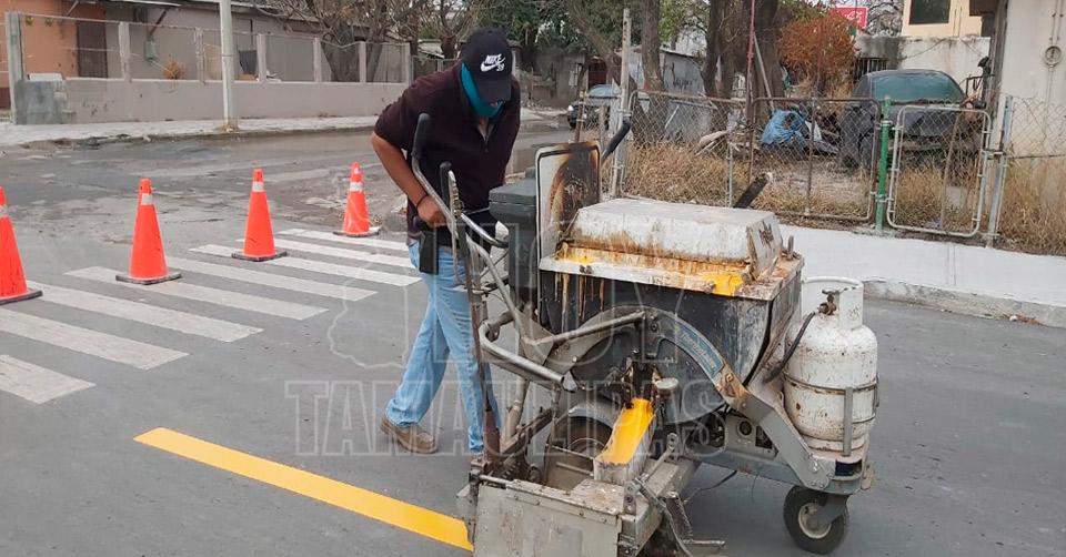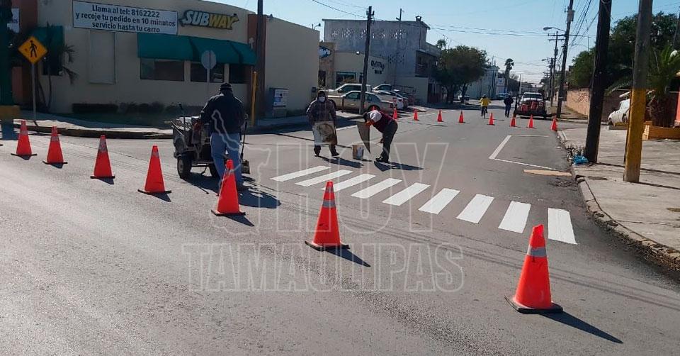 Trabajan en señalización y pinta de carriles en avenidas principales de Matamoros