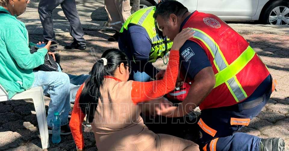 Funcionaria auxilia a adulto mayor tras caerse en la explanada de la Presidencia de Madero