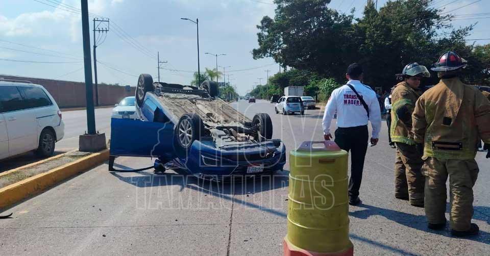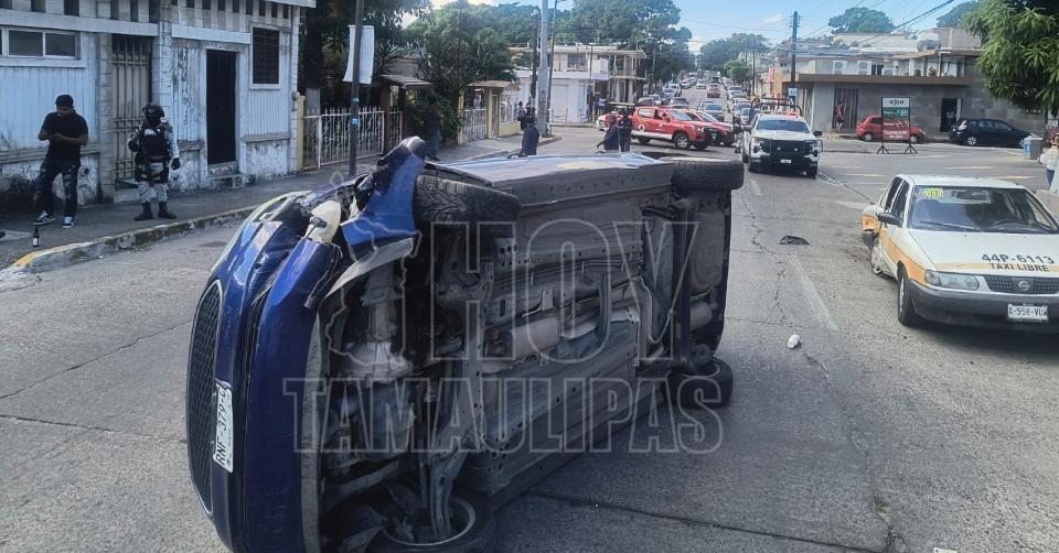 Vuelca auto tras chocar contra taxi en Ciudad Madero
