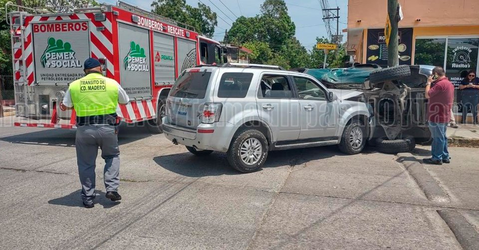 Dos lesionados y cuantiosos daños, dejó aparatoso choque-volcadura en Madero
