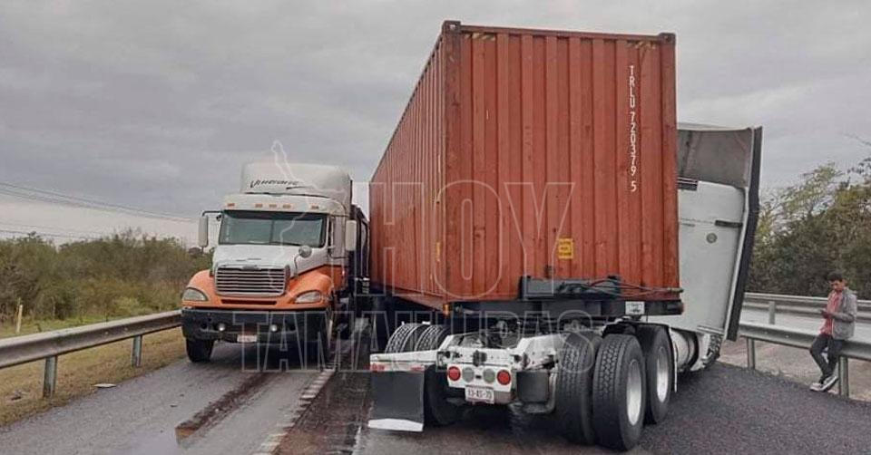 Pavimento mojado genera accidente de tracto camión en Altamira