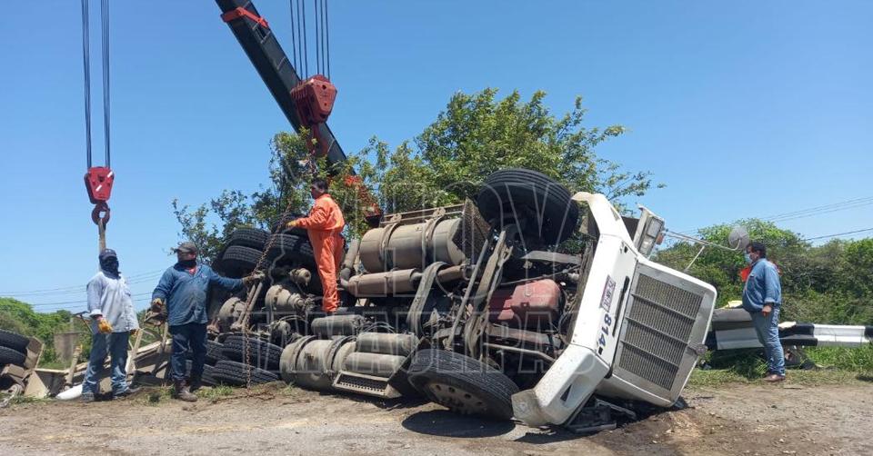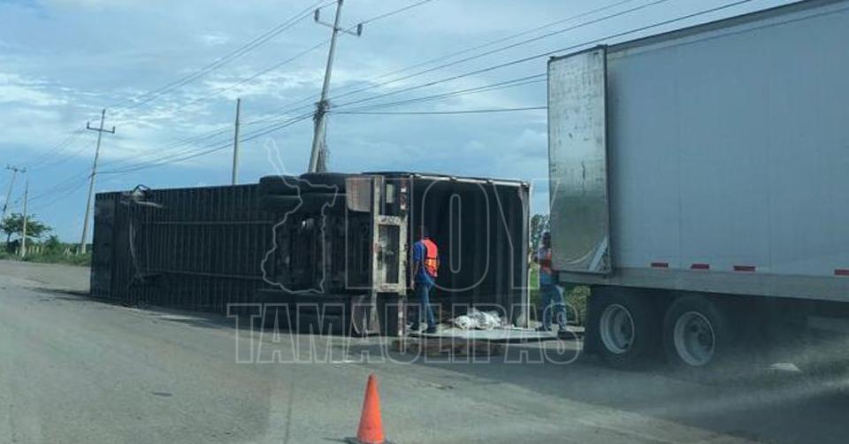 Vuelca caja de tractocamión en el puente roto de Altamira