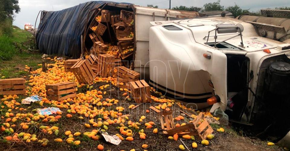 Vuelca camión cargado con piña y mango en la carretera Tampico-Mante