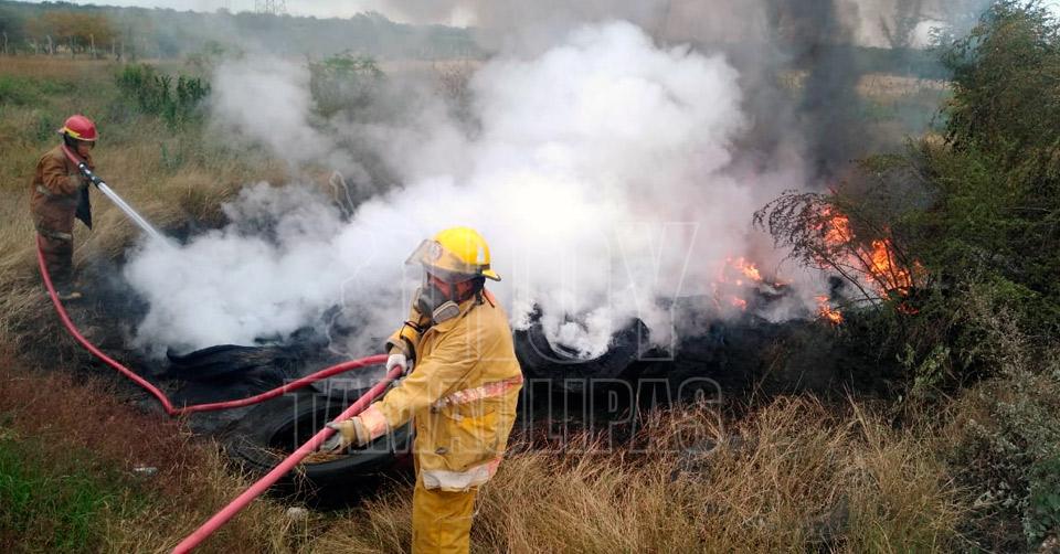 Incendio de llantas moviliza a Bomberos en ejido de Altamira