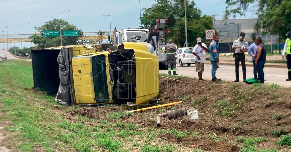 Vuelca camión de volteo en la zona industrial de Altamira