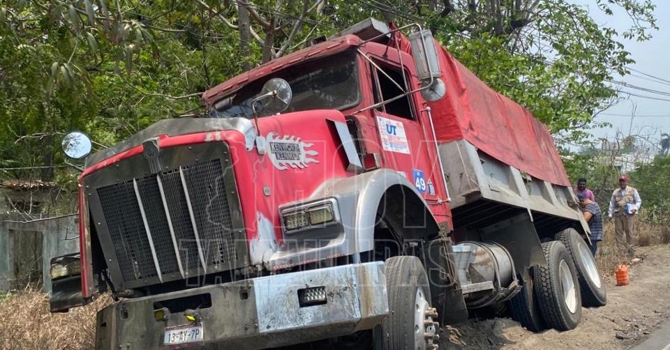 Chofer de camión de volteo hizo un mal cálculo y se salió del camino en Altamira