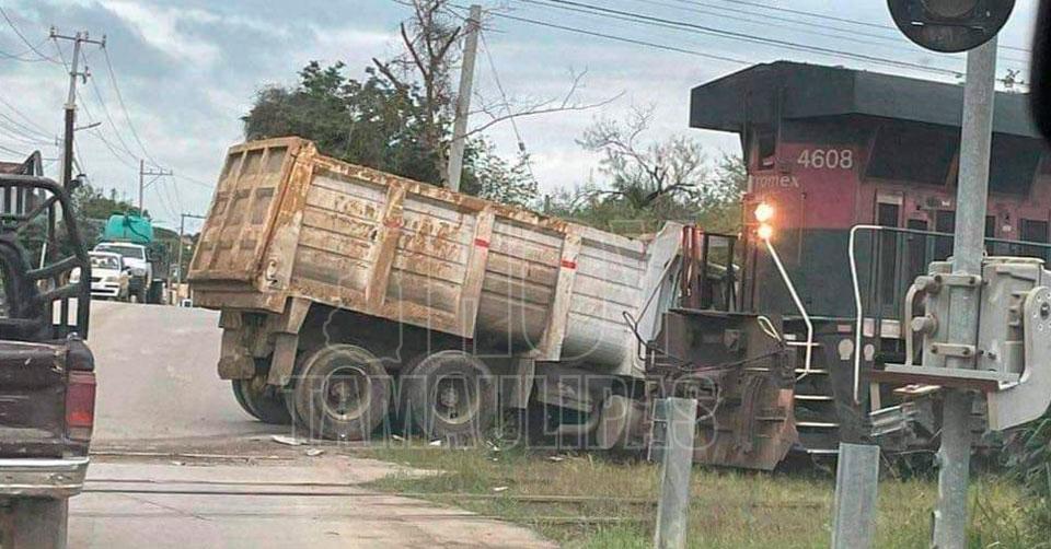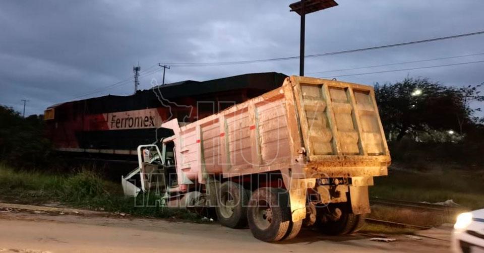 Chofer de camión de volteo intentó ganarle el paso al tren en Altamira
