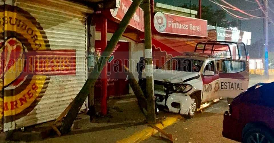 Destrozan patrulla de la Guardia Estatal al impactarla contra un carro y un poste en Altamira