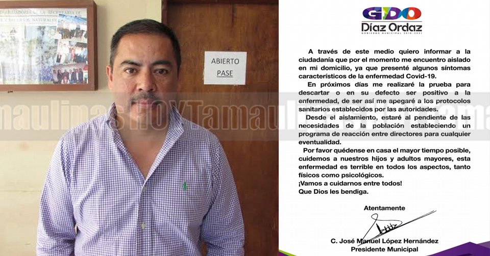 Alcalde de Díaz Ordaz se aísla ante un posible contagio de Covid-19