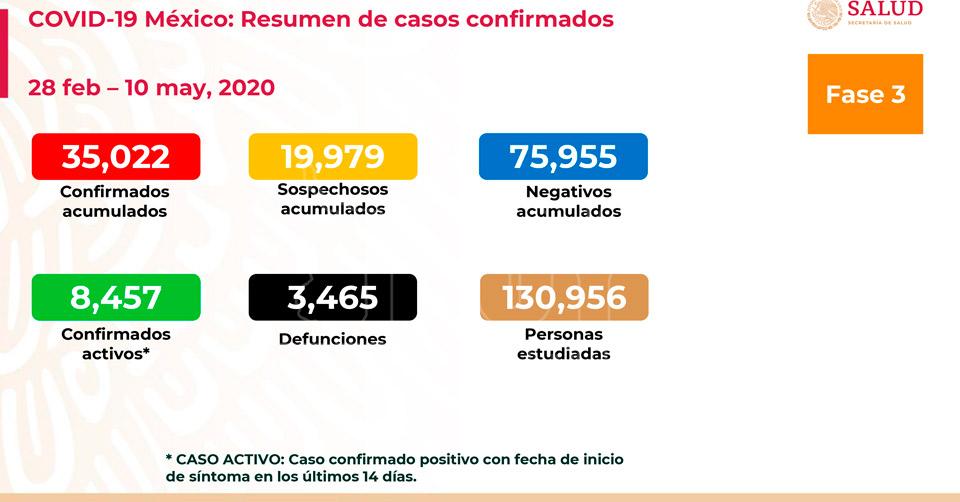 Suman 35,022 casos de COVID-19 y tres mil 465 defunciones en México