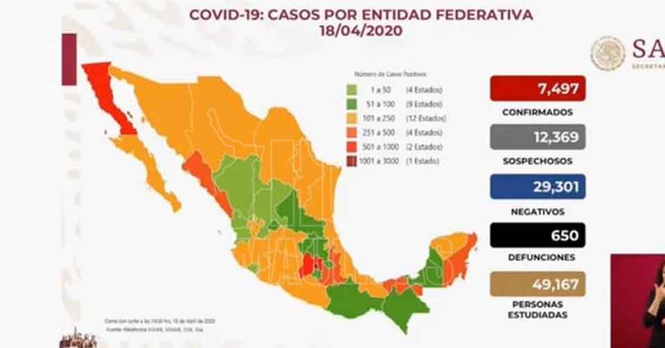 650 defunciones por Covid-19 en México; 7 mil 497 casos positivos