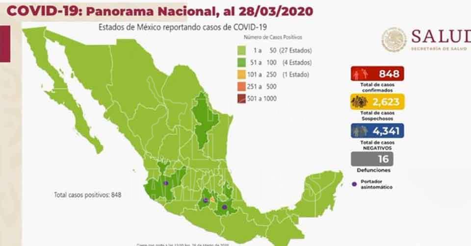 Ya van 16 muertos por Covid-19 en México y hay 848 casos positivos