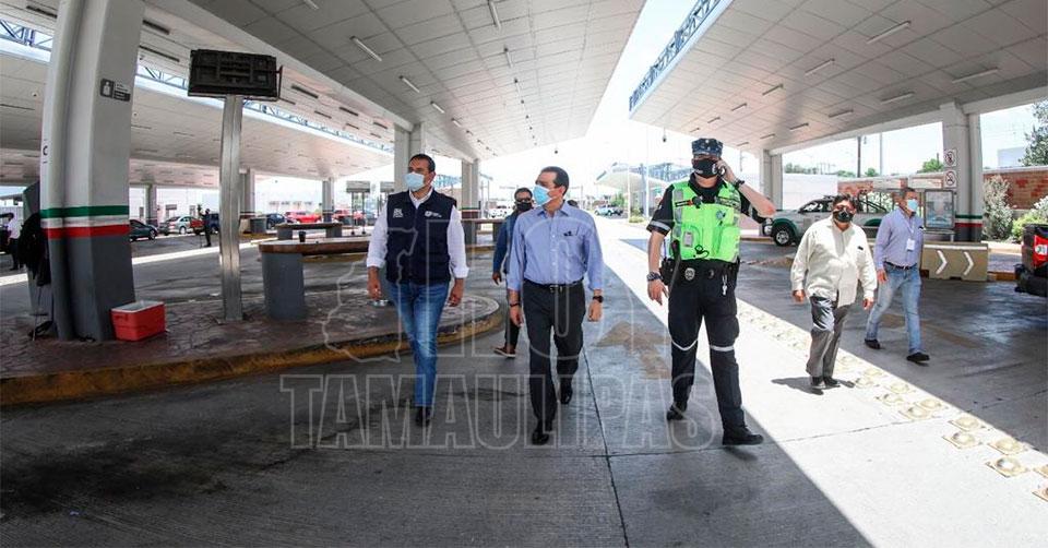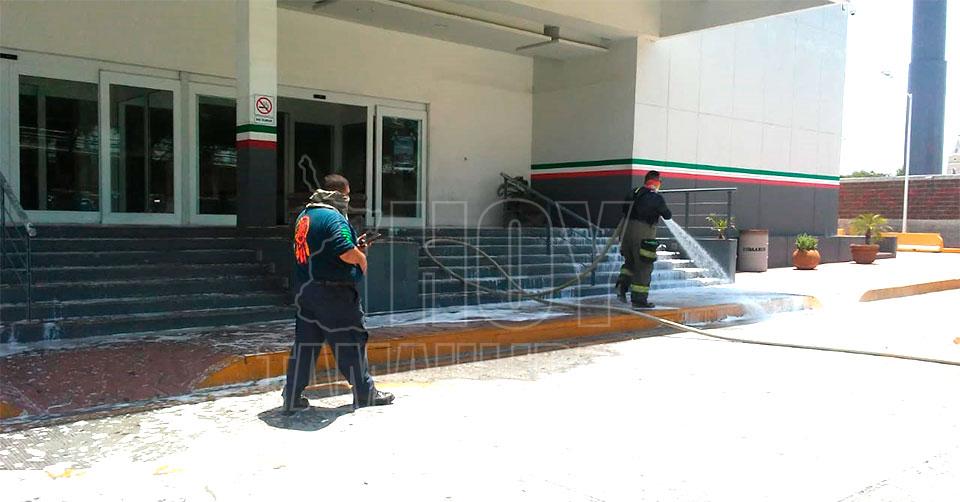Protección Civil y Bomberos de Nuevo Laredo desinfecta área de autobuses en Puente II