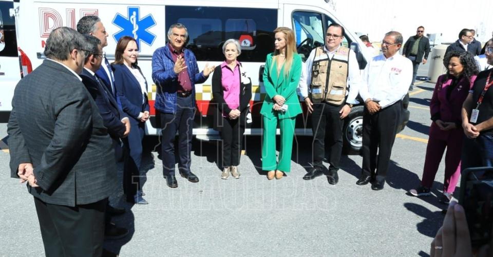 Américo Villarreal y Carmen Lilia Canturosas supervisan albergue de migrantes y DIF estatal entrega ambulancia