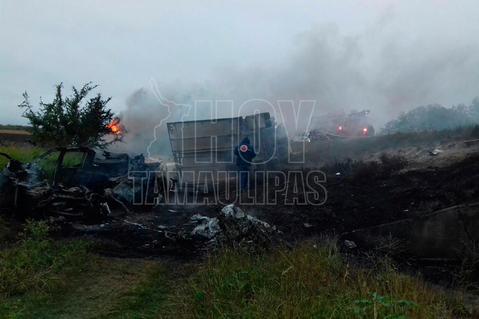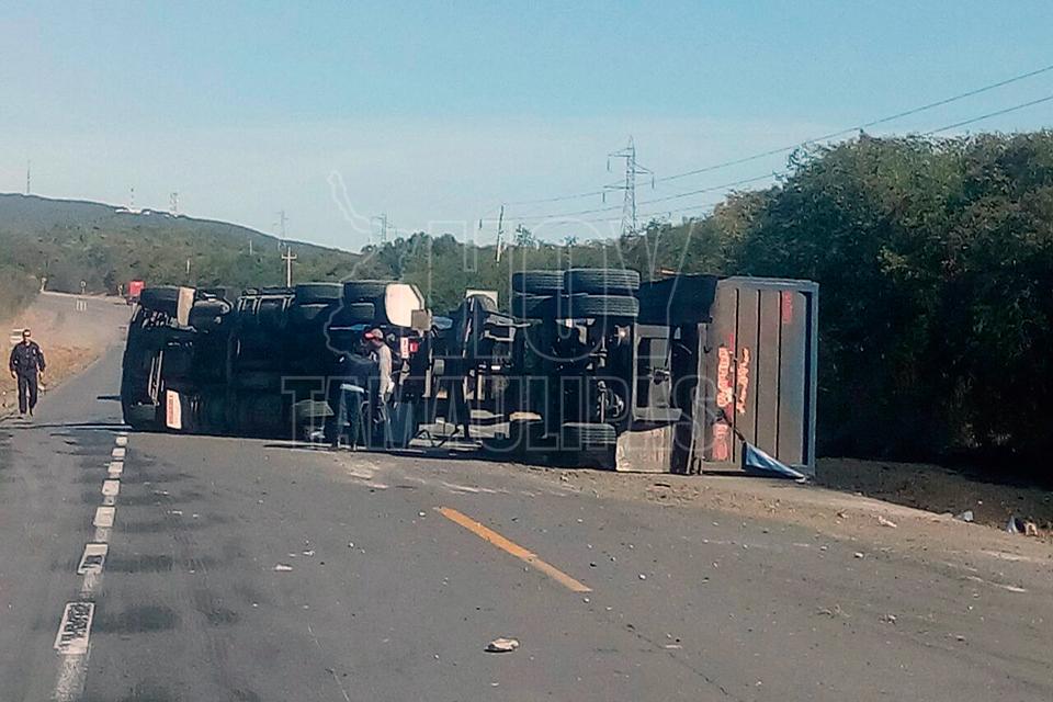 Ilesos trailero y hermano al volcarse en Villagrán, Tamaulipas