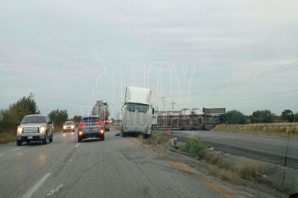Sale tractocamión de la carretera y vuelca remolque en Altamira