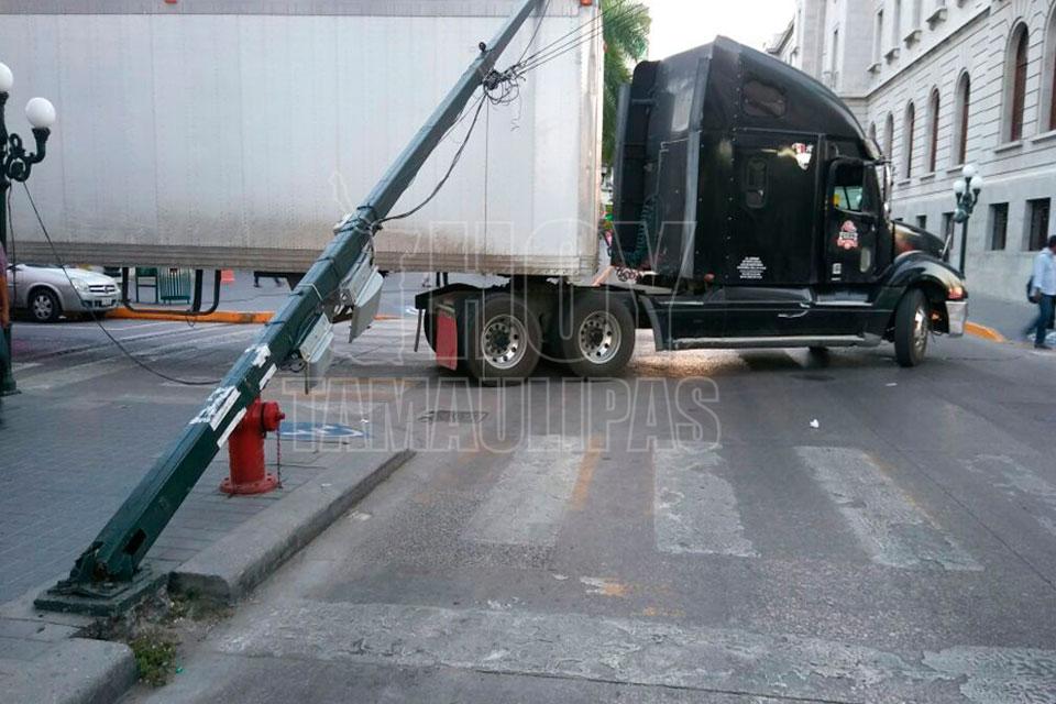 Tráiler tumba poste de alumbrado frente a Presidencia de Tampico