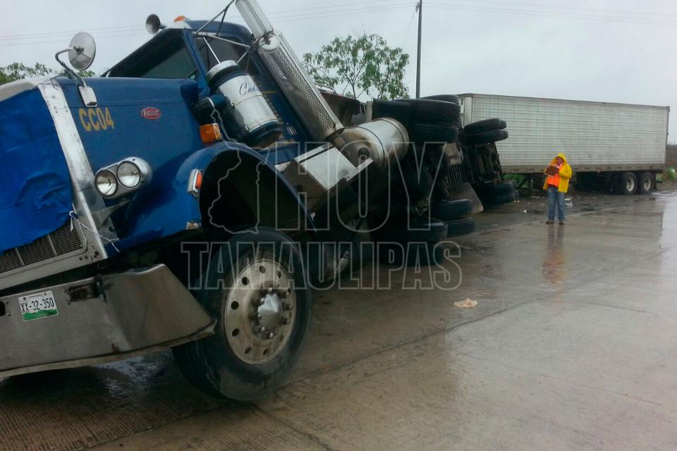 Vuelca tráiler con doble remolque en el Puente Roto