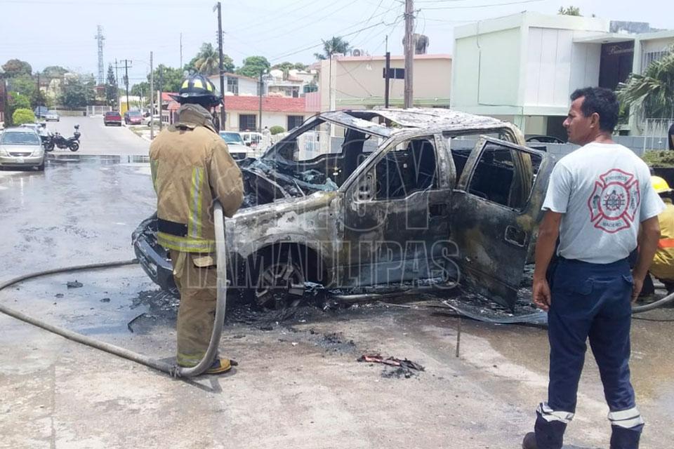 Camioneta queda reducida a chatarra al incendiarse en Madero