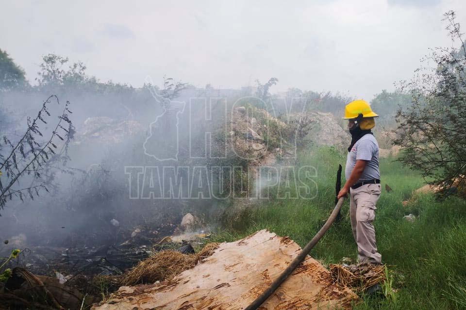 Fuerte incendio de zacatal en predio abandonado en Madero