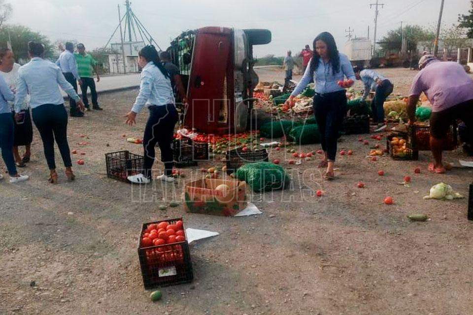 Vuelca mujer en su camioneta llena de verduras en González