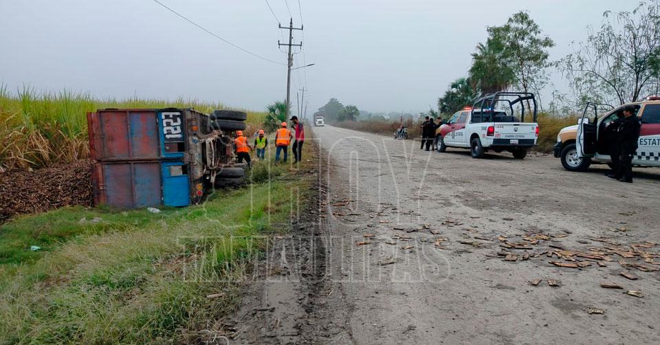 Vuelca camión cargado con 20 toneladas de caña en El Mante
