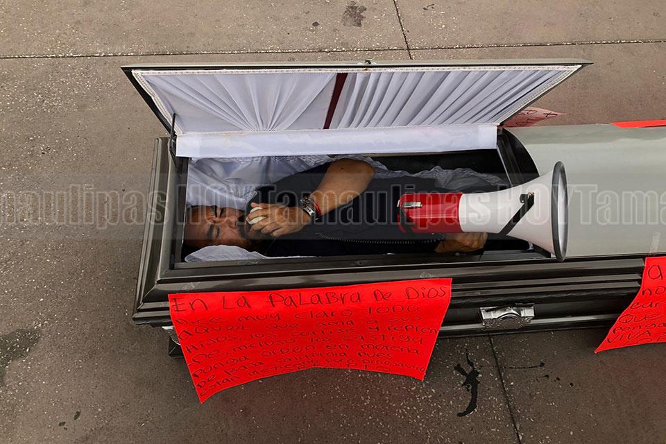 Dentro de un ataúd, un hombre se manifestó frente a Palacio Nacional